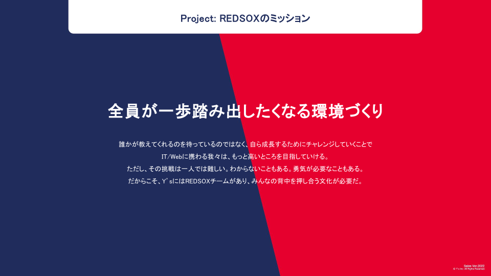 こんにちは、人事の菅野です!Y’sでは、学習する組織を目指し、今年から新たな取り組みをスタートしました。これまで記事の中で登場していたREDSOXチームについて、今回はその全貌をお届けします!